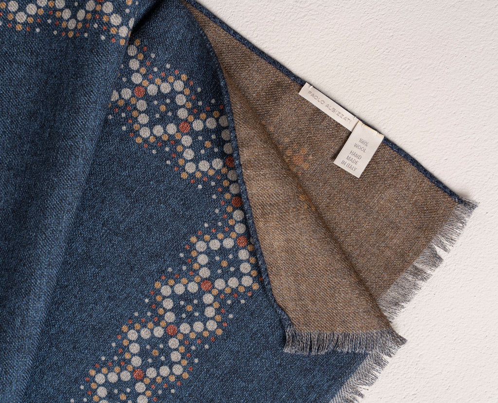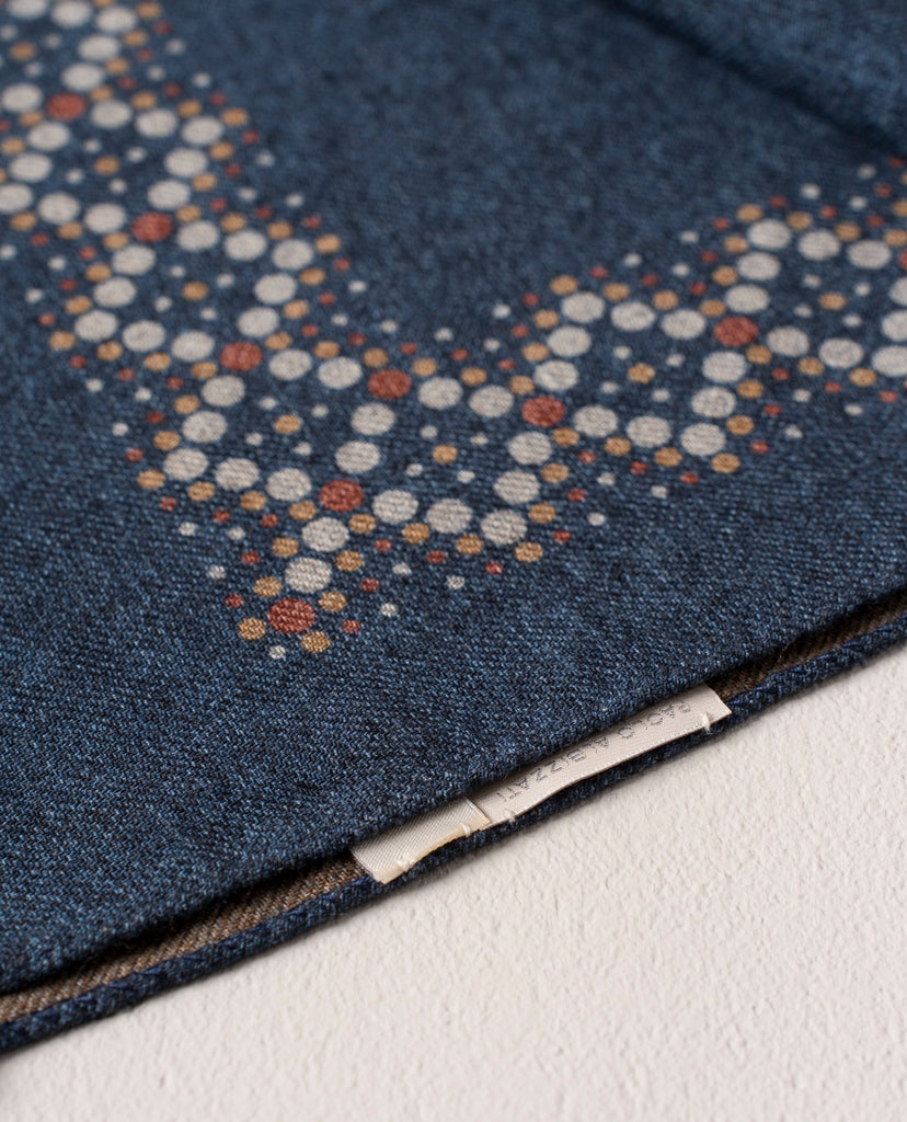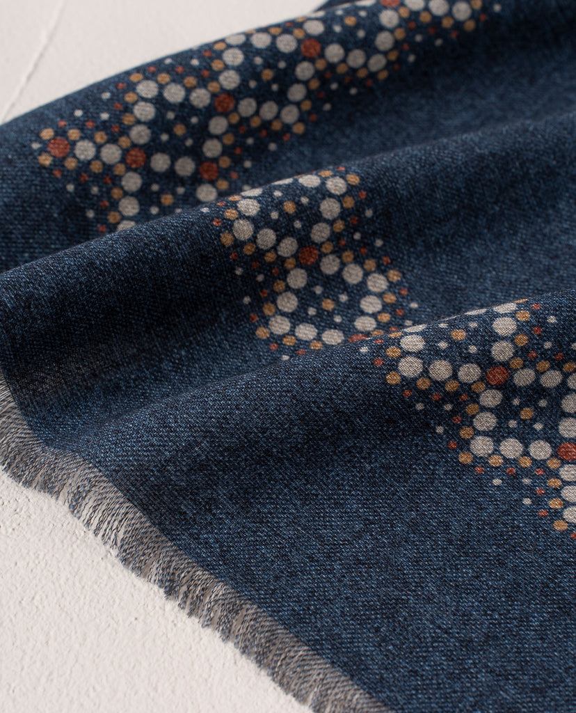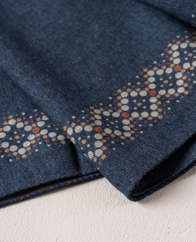 The Blue flannel wool scarf can be easily styled in casual and formal ways. A sophisticated blue melange solid base is tastefuly decorated with the dotted print on the hems.