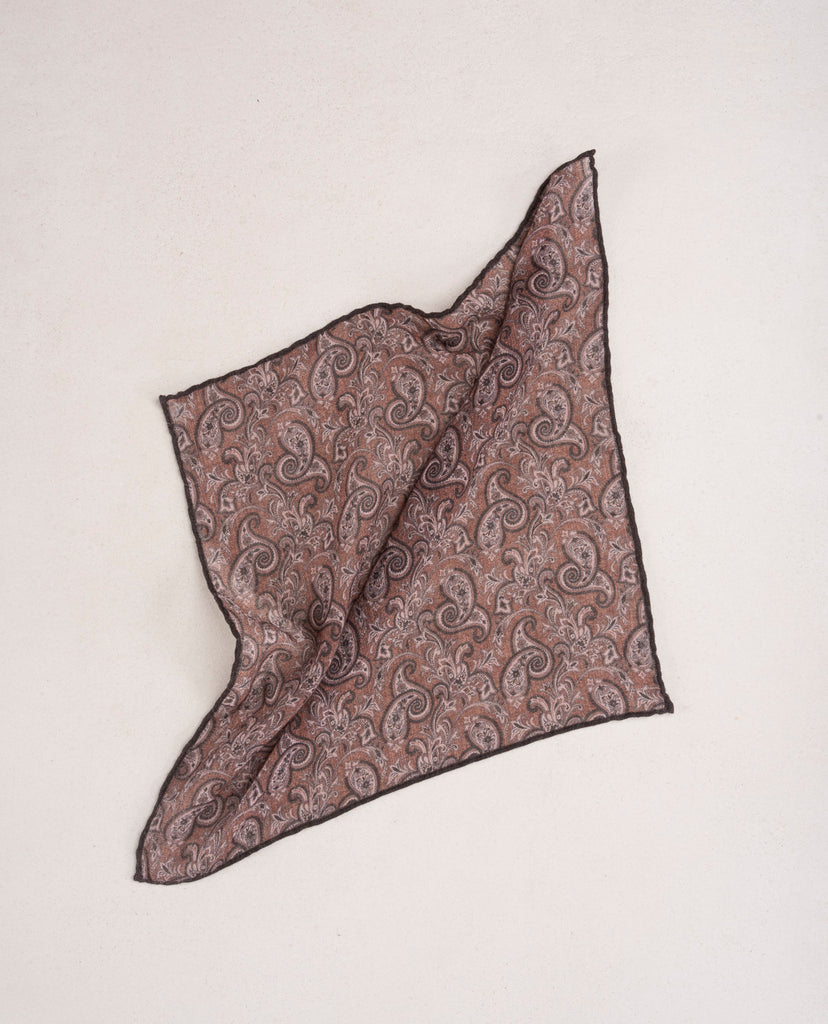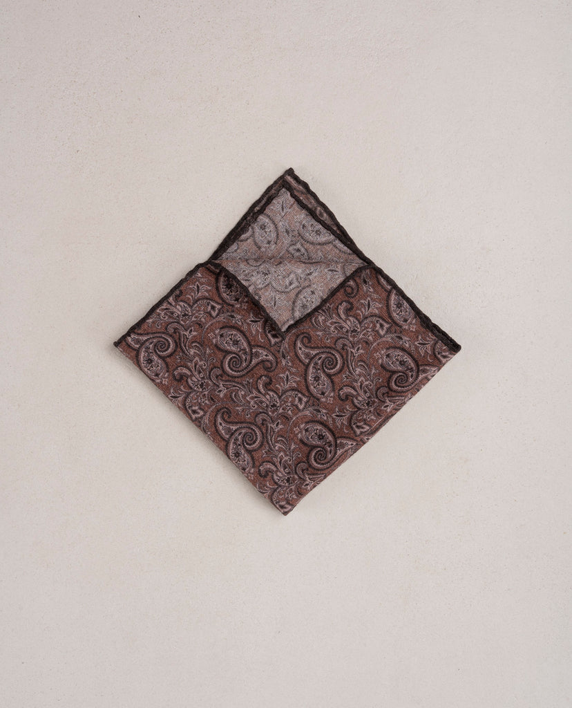 Experiment with a Pocket Square this season, it serves as an added point of interest. This Brown Paisly Print is performed on softest exclusive wool. Avaliable also in Beige and Navy Blue.