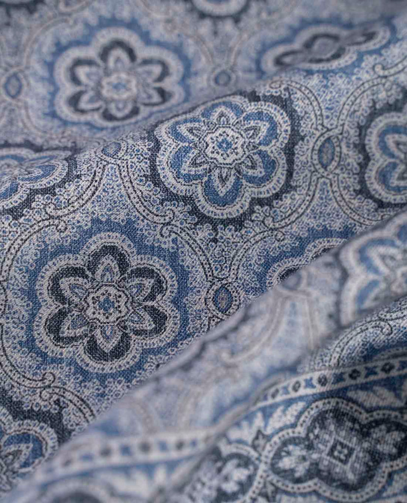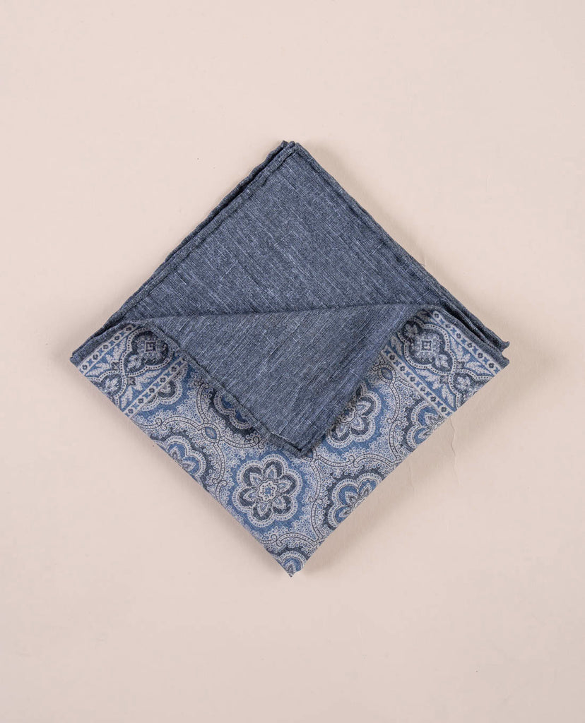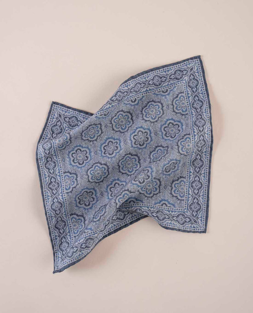 Double Printed Wool Cotton Pocket Square - Large Medallion Denim Blue