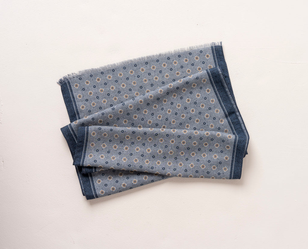 Paolo Albizzati’s Grey Melange Scarf has all of the characteristics a perfect men’s scarf should have: pleasant soft flannel wool material, a classic medallion pattern with dots on reverse and elegant colors.