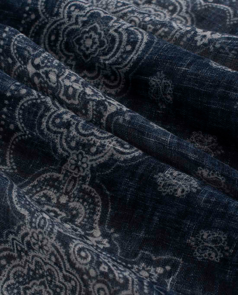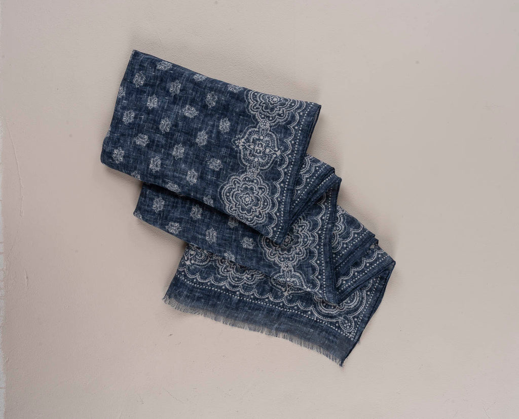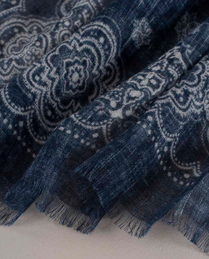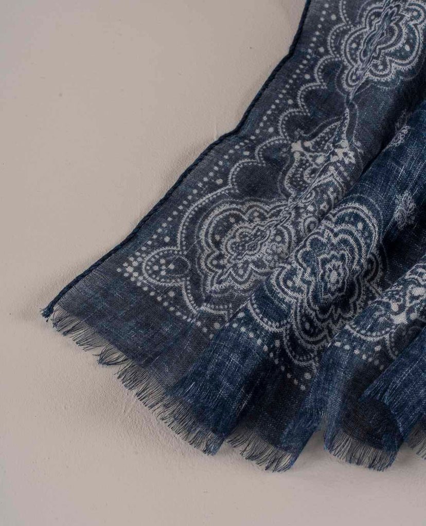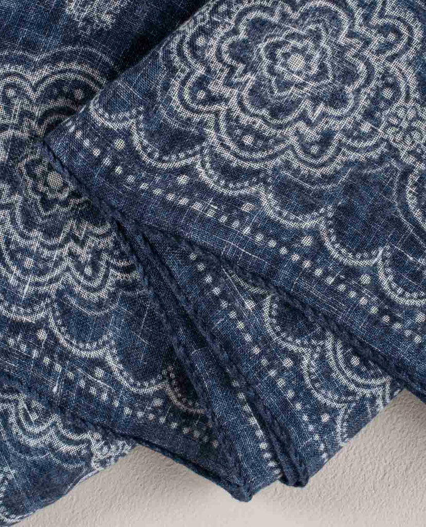 Linen Scarf - Navy Blue Classic Medallion Print