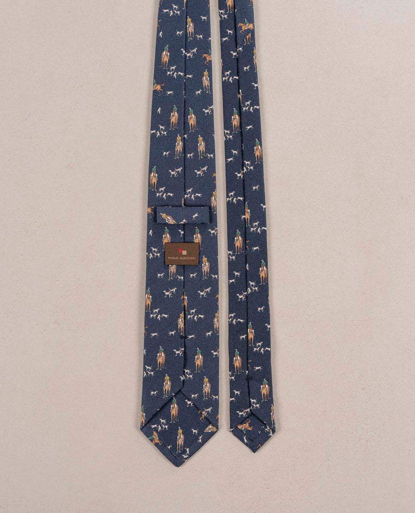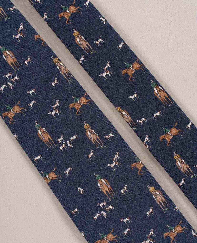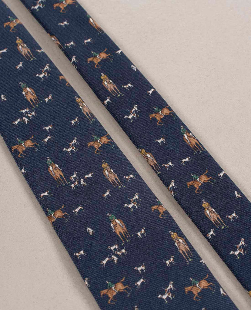 The Navy Blue Vintage print Tie is elegant and refined. It is great to create more casual looks. The Hunting Scene Print is from Family Archives.