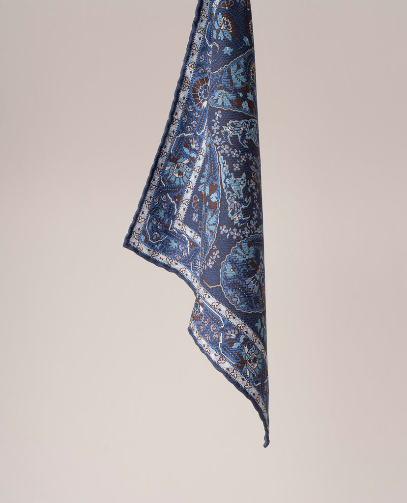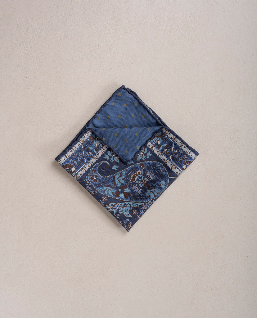 This blue double printed Pocket Square with paisley in front and dots on the back is an essential styling accessory this season.