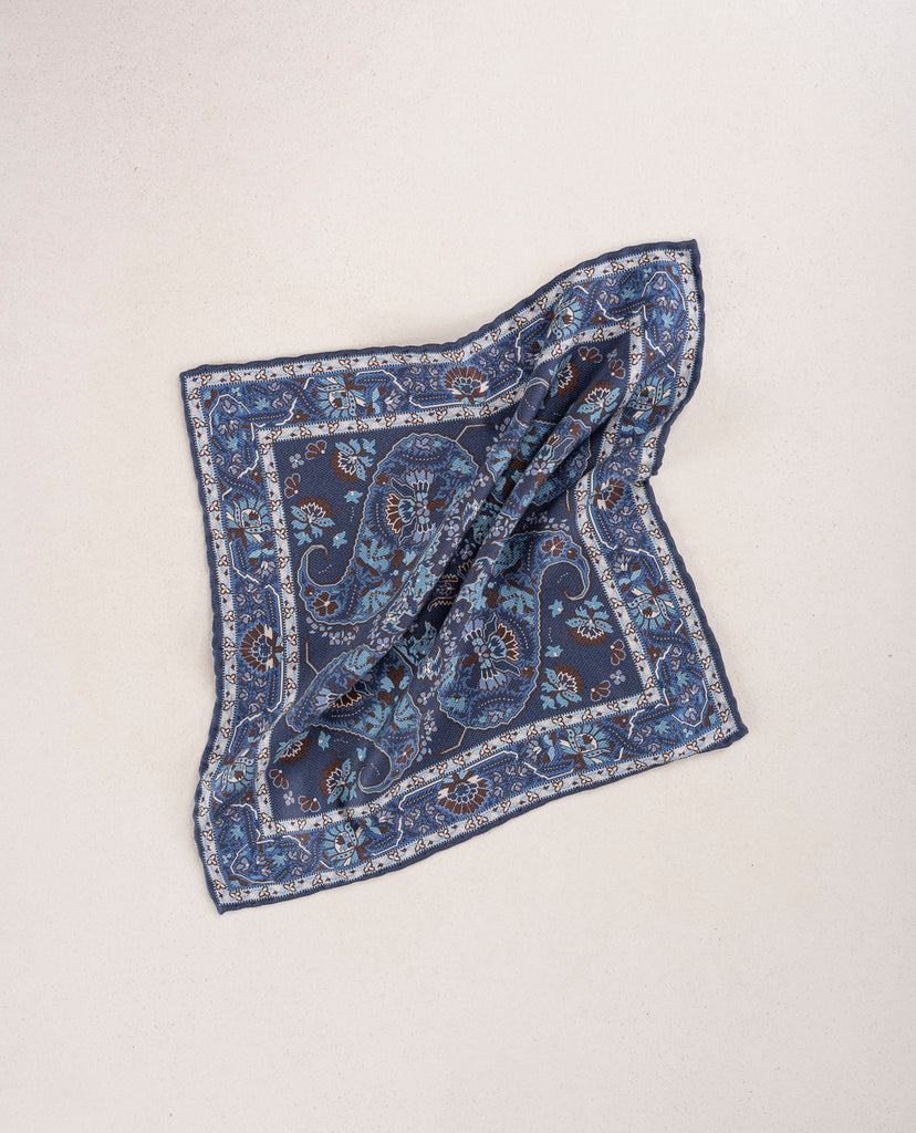 Reversible Silk Pocket Square - Blue Paisley Foulard Print