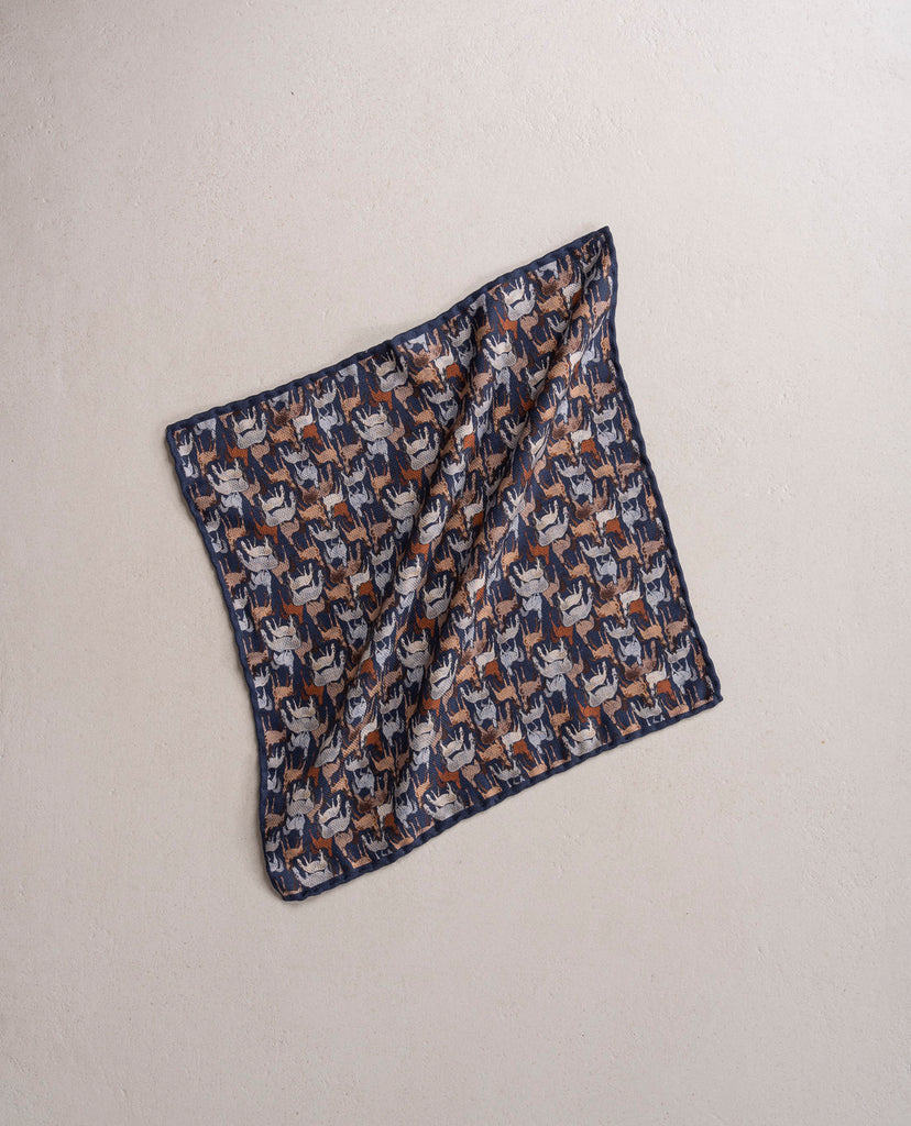 Navy Blue Horses Print Reversible Silk Pocket Square