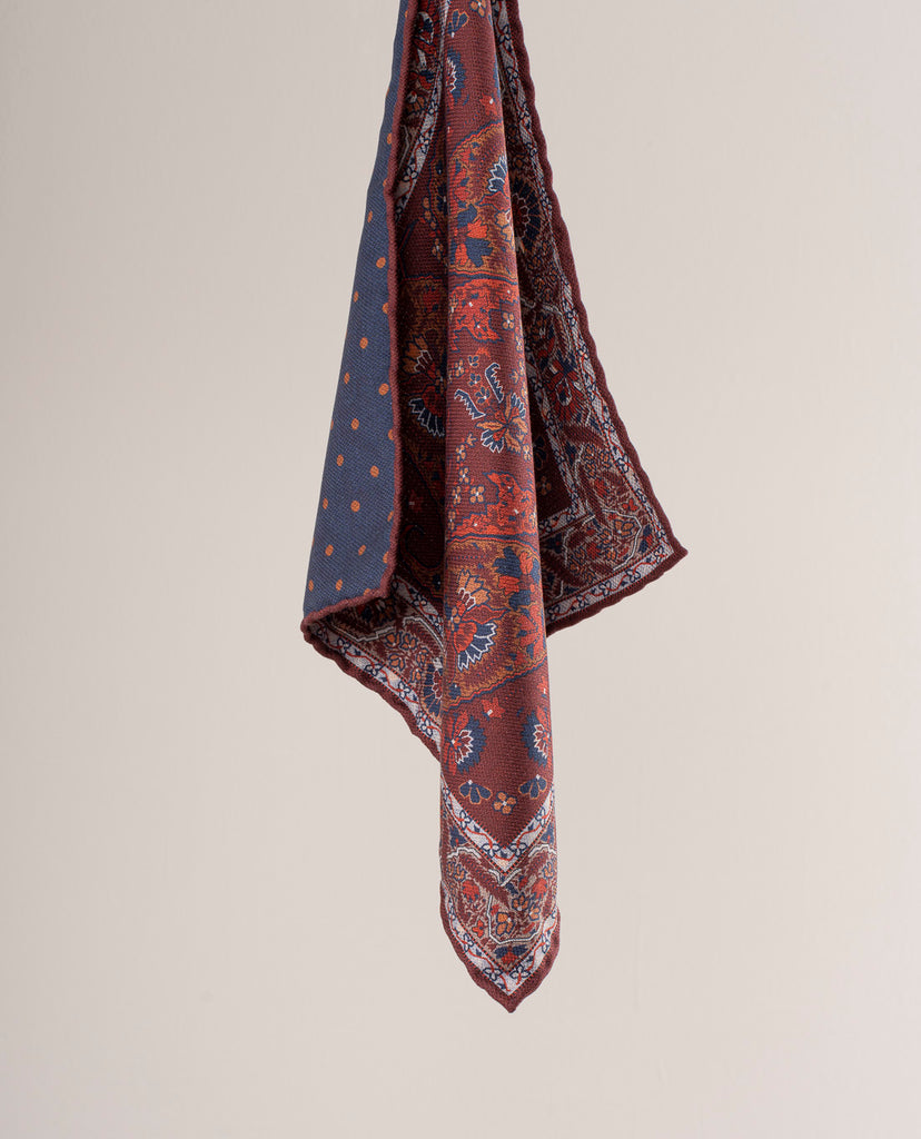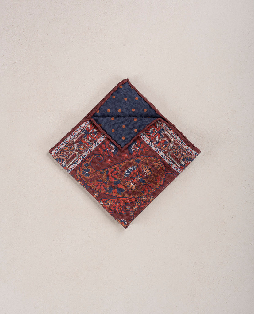 This double printed Pocket Square with paisley in front and dots on the back is a functional and pragmatic accessory. It is reversible and can be worn on both sides.