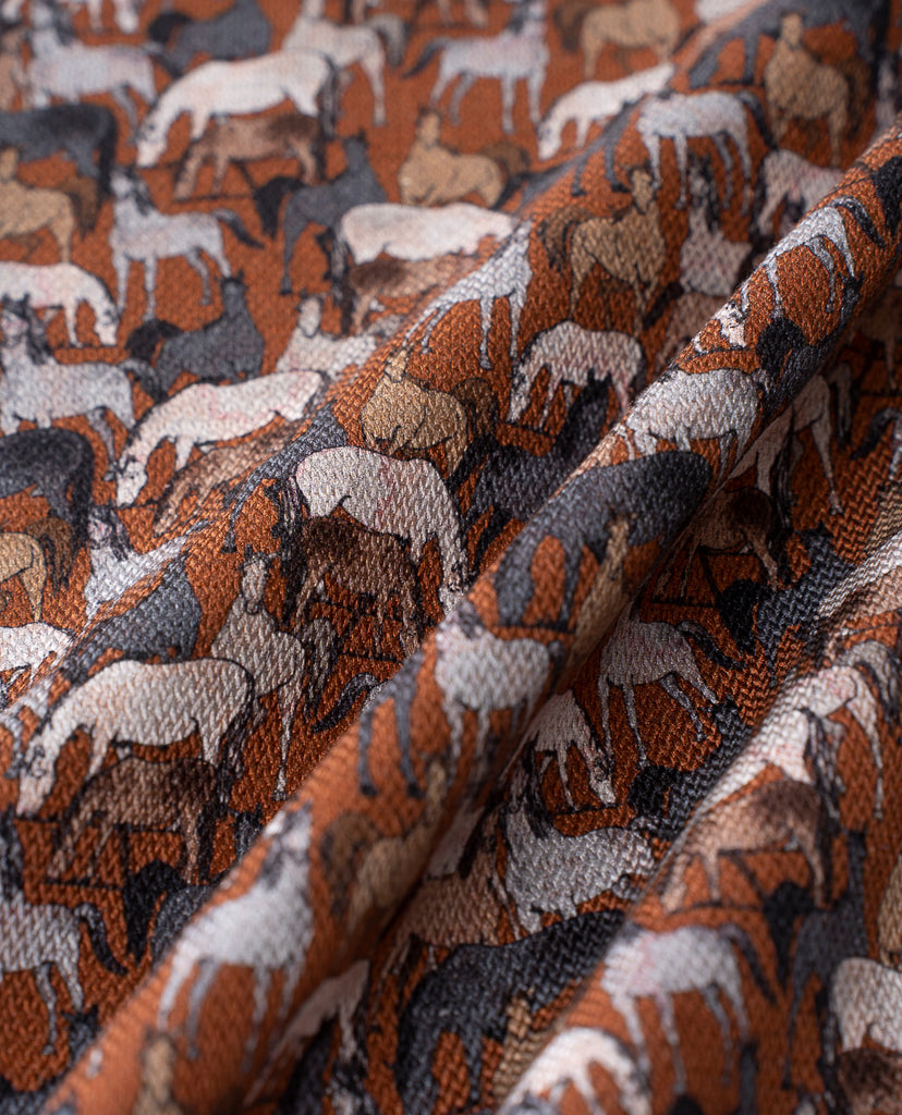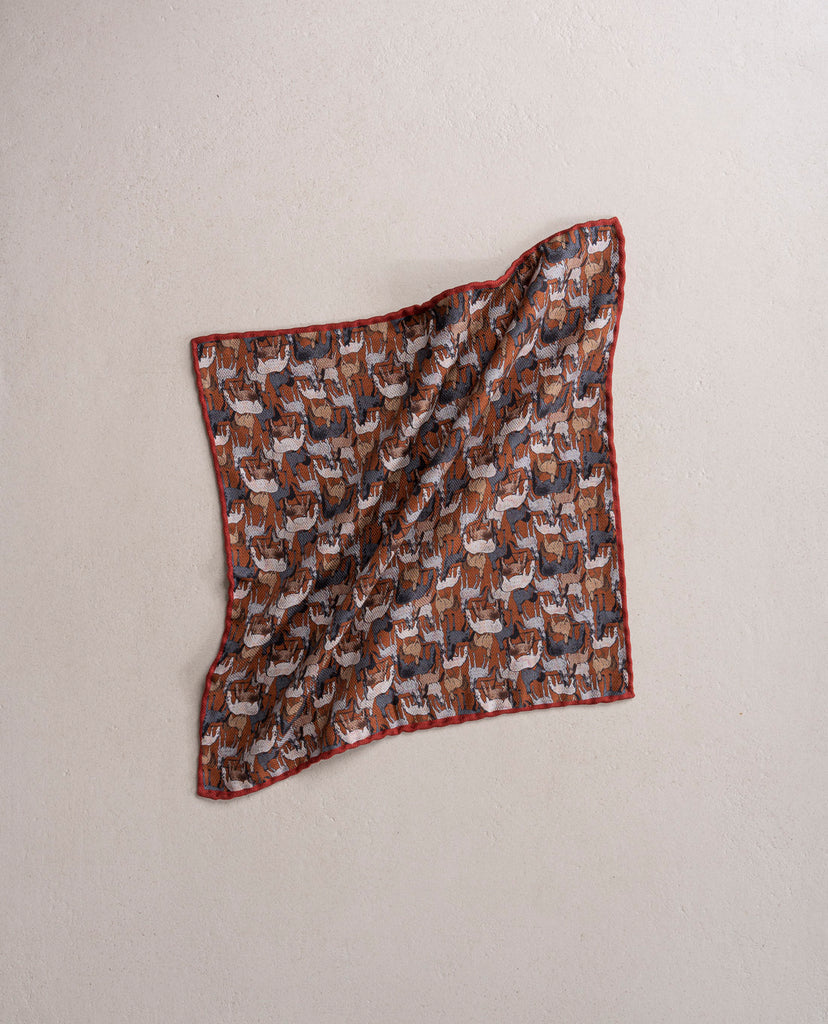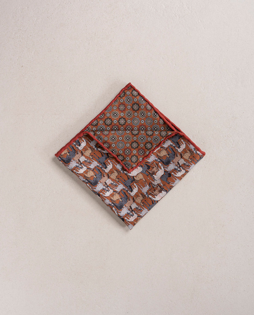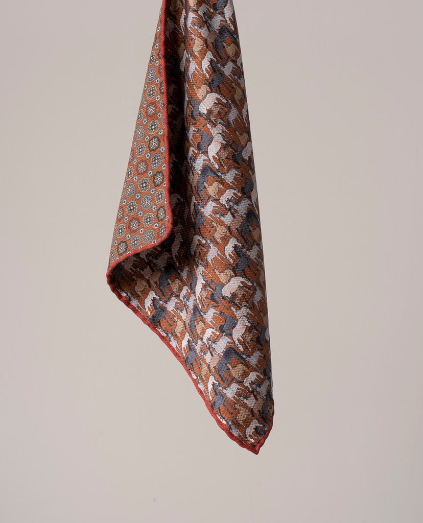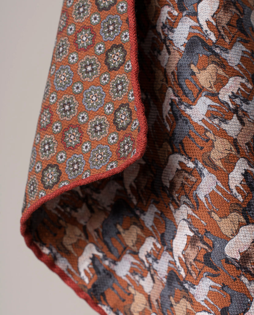 This Silk Pocket Square features the Horses Print from our Family's Archives and medallion print on the reverse. Experiment with unique and colorful Pocket Square this season, it serves as an added point of interest. Available in navy, rust and green.