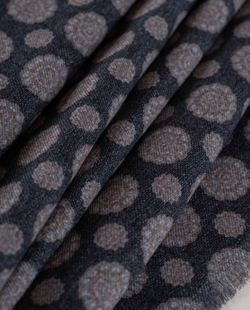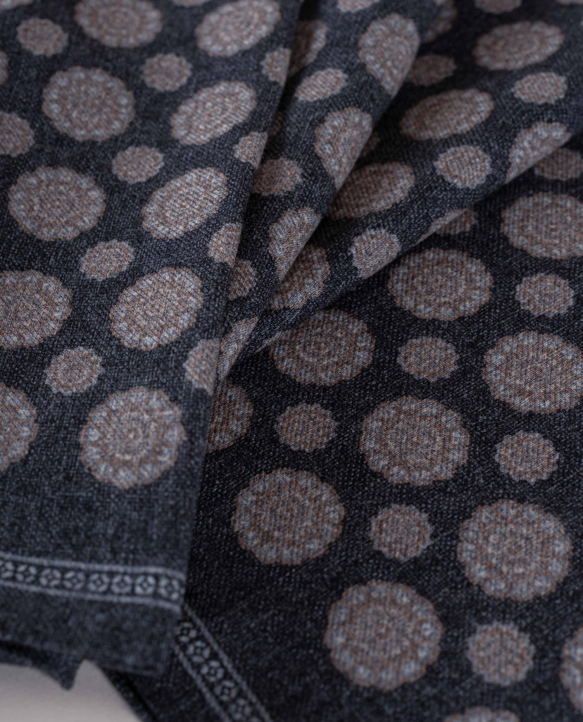 The Charcoal Grey flannel wool scarf can be easily styled in casual and formal ways. A refined melange base is tastefully decorated with medallion print.