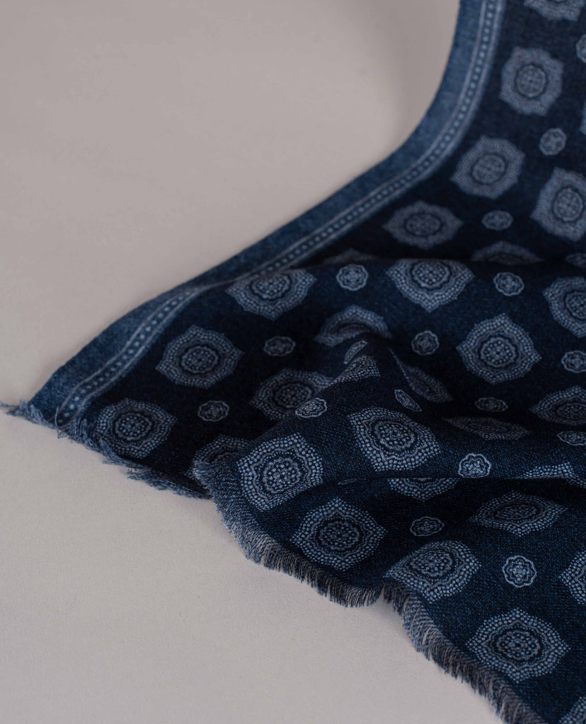 Wool Printed Scarf - Navy Blue Melange Medallion Print